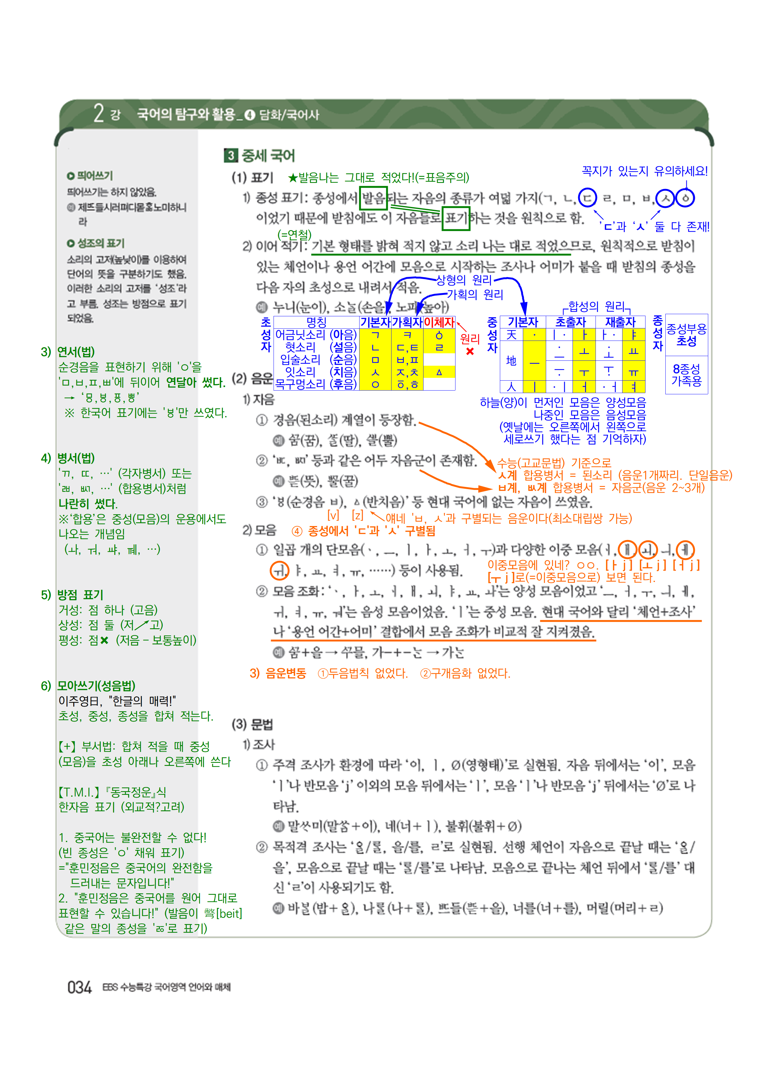 34쪽 [3] 중세국어 - (1) 표기 부분 필기 (날개에다 쭉 필기)