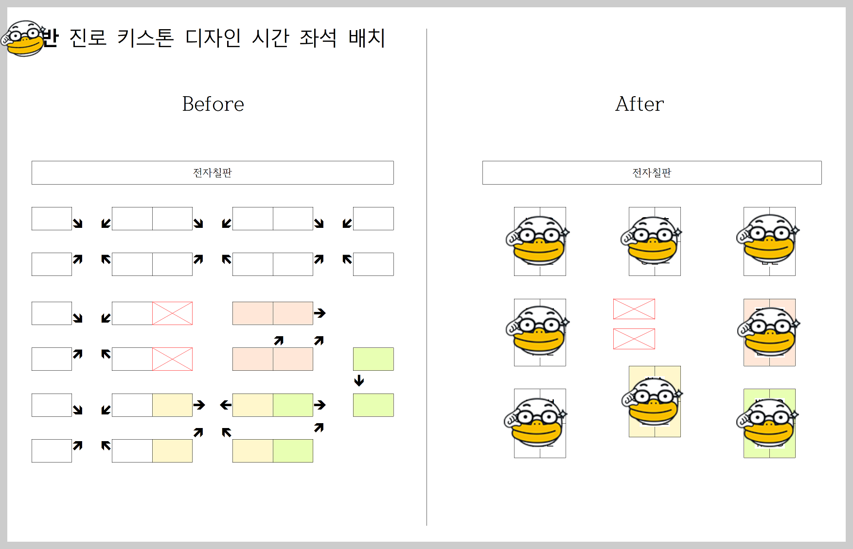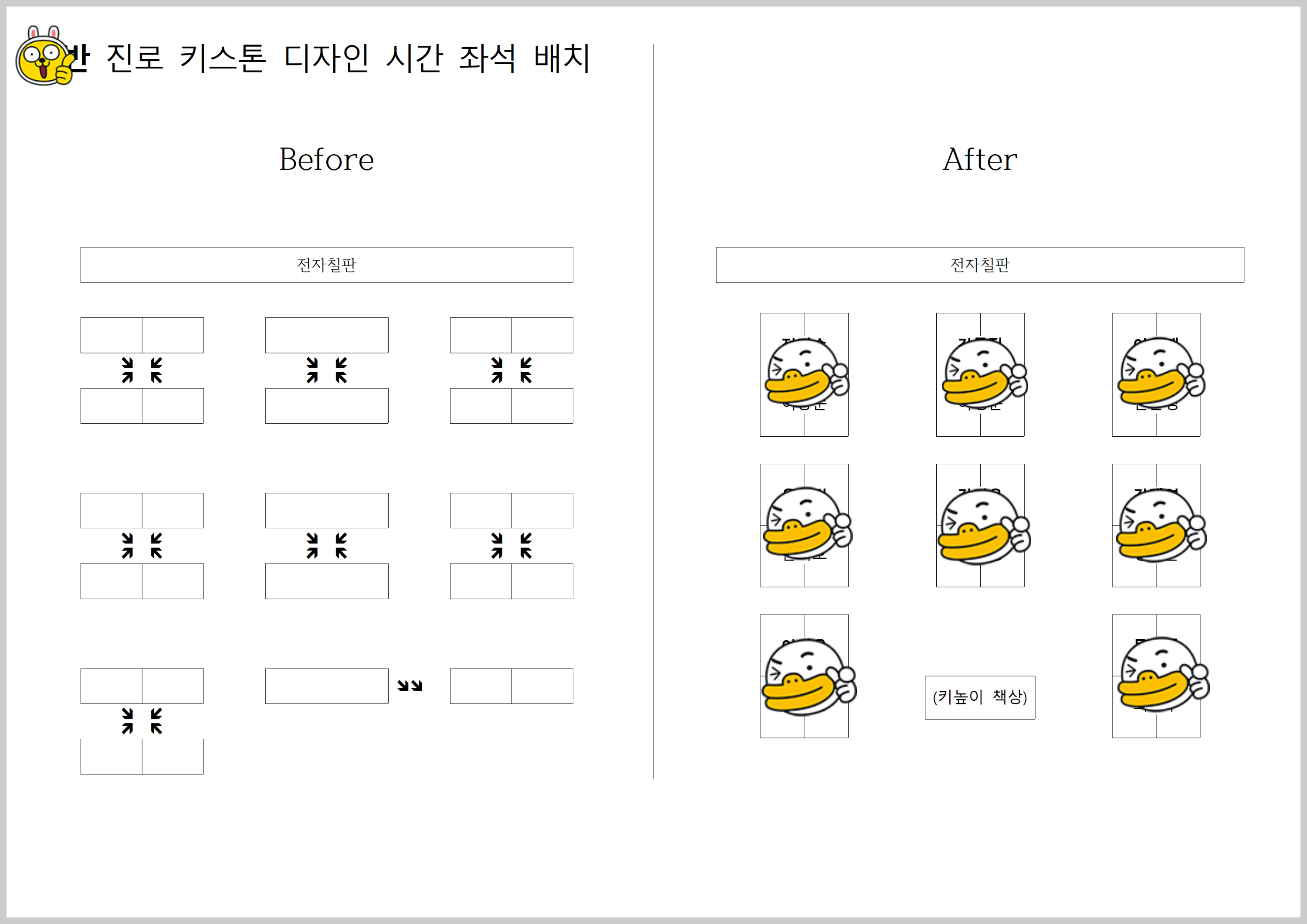 (책상을 90도 돌려 모아놓고, 연고지로 가서 앉으시면 됩니다)